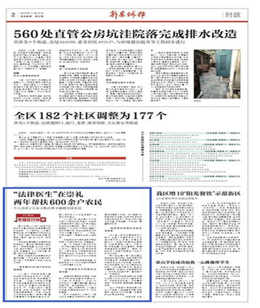 2018年11月27日,《新东城报》2版时政栏以《“法律医生”在崇礼两年帮扶600余户农民》为题,报道了北京中勉律师事务所主任杨晓刚律师在崇礼的法律服务、精准扶贫事迹。